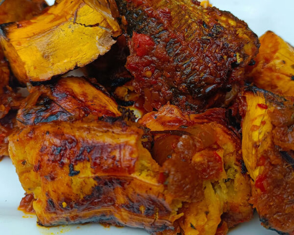 A true Nigerian street food delight! Grilled ripe plantains served with a rich pepper sauce, garnished with fish or chicken for the perfect smoky, spicy, and savory combination. A taste that brings Port Harcourt’s famous flavor straight to your plate.